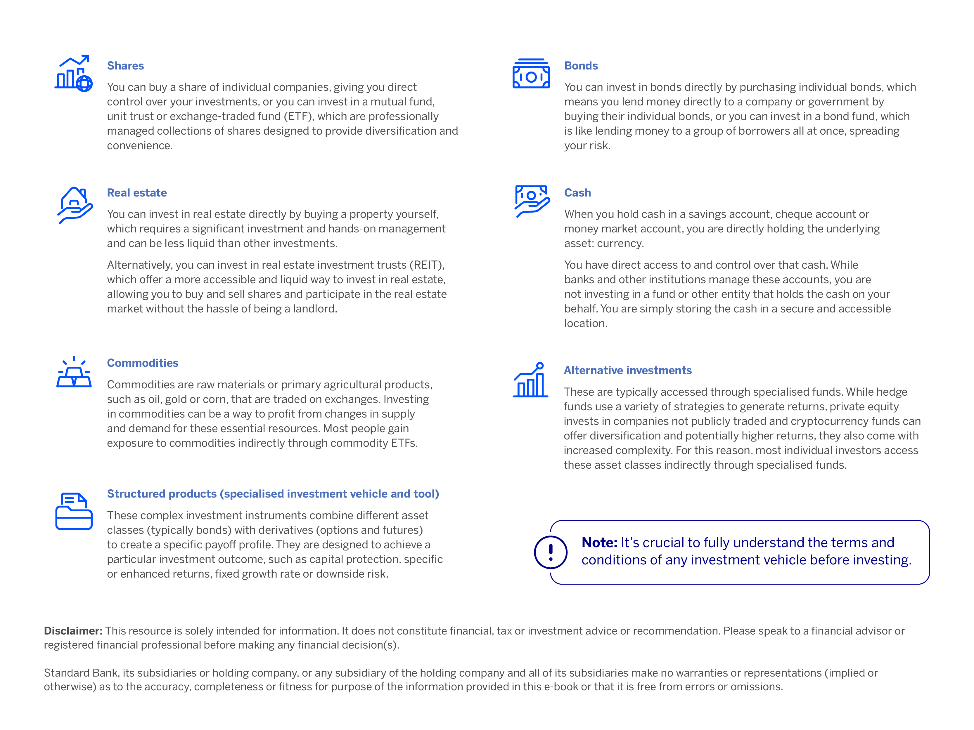 Investing is putting your money in something, i.e. buying assets such as shares, unit trusts or property, with the expectation that your investment will make money for you. Investments usually achieve long-term goals and can make your money work for you, helping you to create and preserve wealth.
